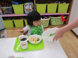 手洗いの様子も見ていただき、 みんなでお歌を歌い、「いただきます」のご挨拶。